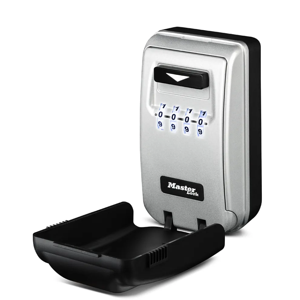 The Master Lock No. 5425D Wall Mount Light-Up Dial Lock Box features a 2-7/8in (72mm) wide metal body for durability. The wall mount design offers permanent installation. The large, easy to read light-up dials, combined with resettable combination functionality, provide a secure storage location for spare keys and access cards. The Limited One Year Warranty provides peace of mind from a brand you can trust.